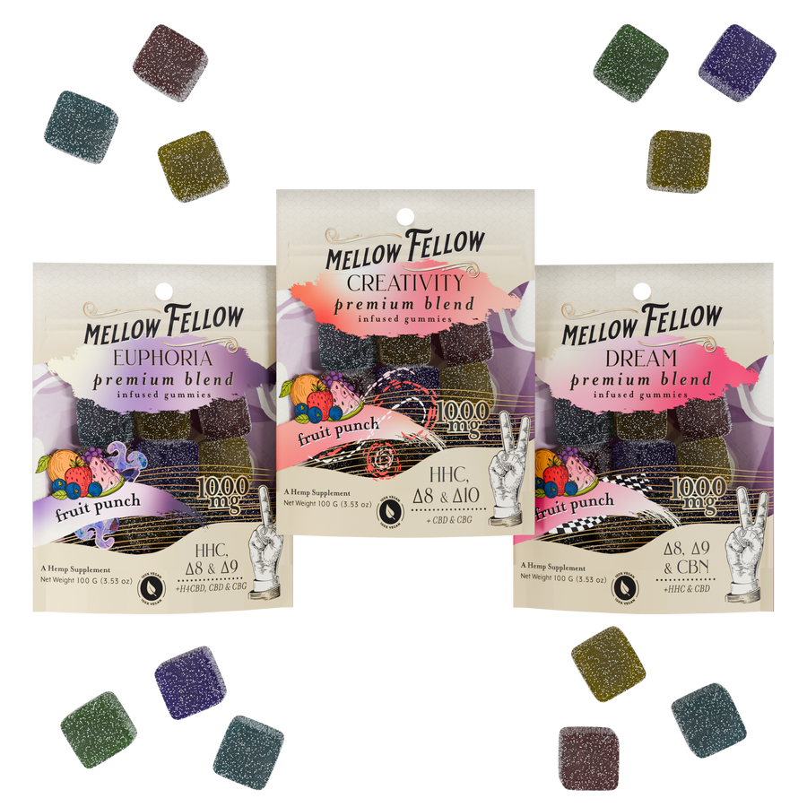 The Creativity Blend - Say goodbye to creative blocks, whether you're struggling with writer's block, a blank canvas, or anything else that's holding you back from unleashing your creativity. With a wide range of options like disposable vapes, edibles, and vape cartridges available, you can explore our collection and get a dose of Creativity today! Unlock your inner artist as Creativity helps you tap into your imagination and let your ideas flow. Good for: enhancing overall joyful effects or when you simply want to uplift your mood and share positive vibes with friends and loved ones. The party blend!, The Dream Blend - Unwind and enter a world of peaceful dreams with the Dream Blend. This unique blend of Delta 8, HHC, CBN, CBD and THCp is perfect for those seeking relaxation or a temporary escape from reality. Experience the benefits of this surreal blend and let it transport you to a place of serenity and zen. Whether it's a disposable vape, vape cartridge or edibles, get yours today and Dream., and The Euphoria Blend - Experience pure bliss and a sense of elation as Euphoria works to leave you feeling refreshed and invigorated. Our Euphoria blend is designed to help you leave behind all of your daily stresses with just one puff. Prepare yourself for an exhilarating experience with this potent PhD Pharmacist-formulated blend that helps create a sense of intense joy and happiness.